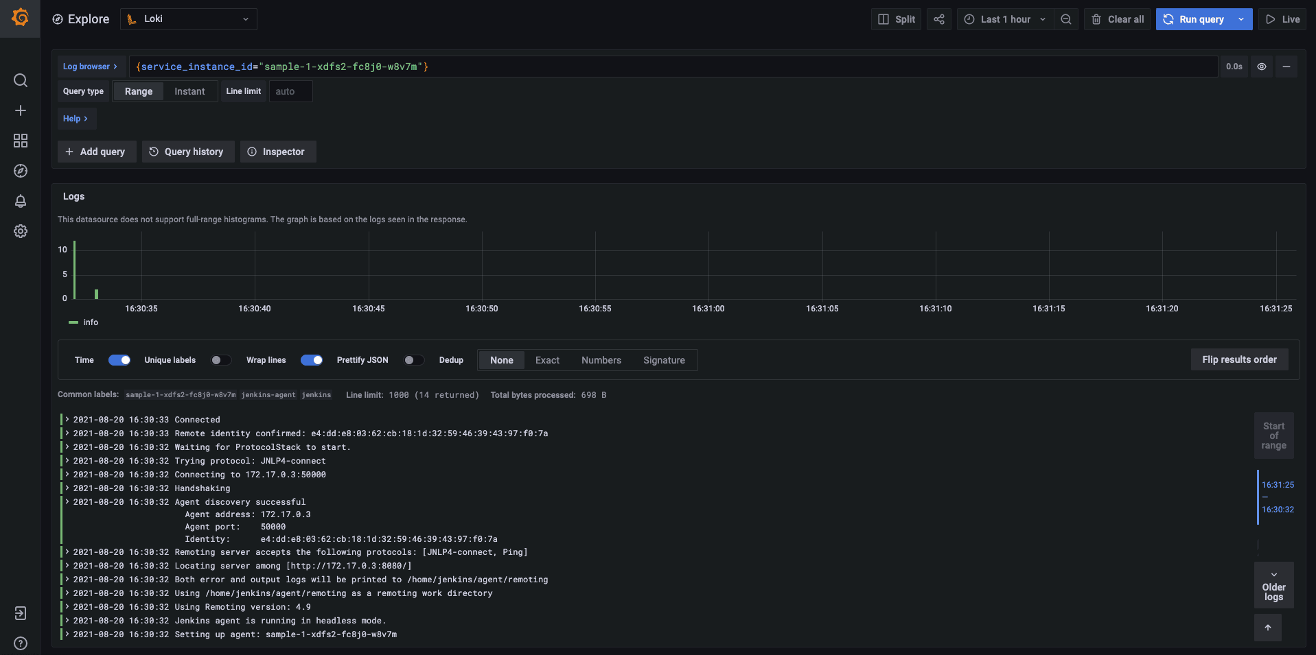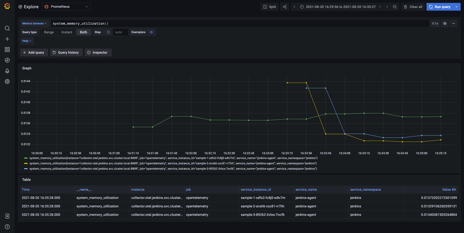 We also prepared a demo with Kubernetes. It sets up all the component mentioned in the Docker Compose Demo section on a Kubernetes cluster, and launches agents using Kubernetes plugin. Service instance id, by which OpenTelemetry identifies the data producing instance, will be automatically set to Jenkins agent name.