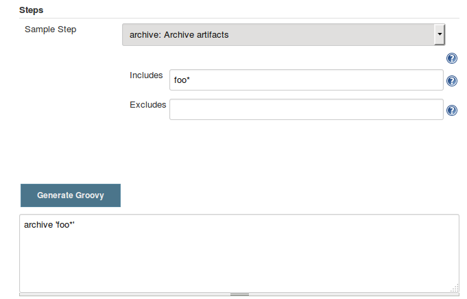 In the Jenkins GUI, go to the config screen for a Pipeline job and click on the Snippet Generator checkbox. Select 'step: General Build Step' from the dropdown, and then have a look at the options that appear in the 'Build Step' dropdown. To compare with our previous work, let’s see what "Archive the artifacts" looks like: