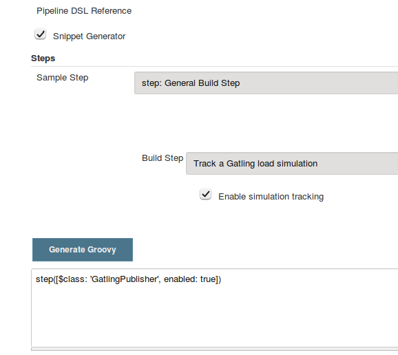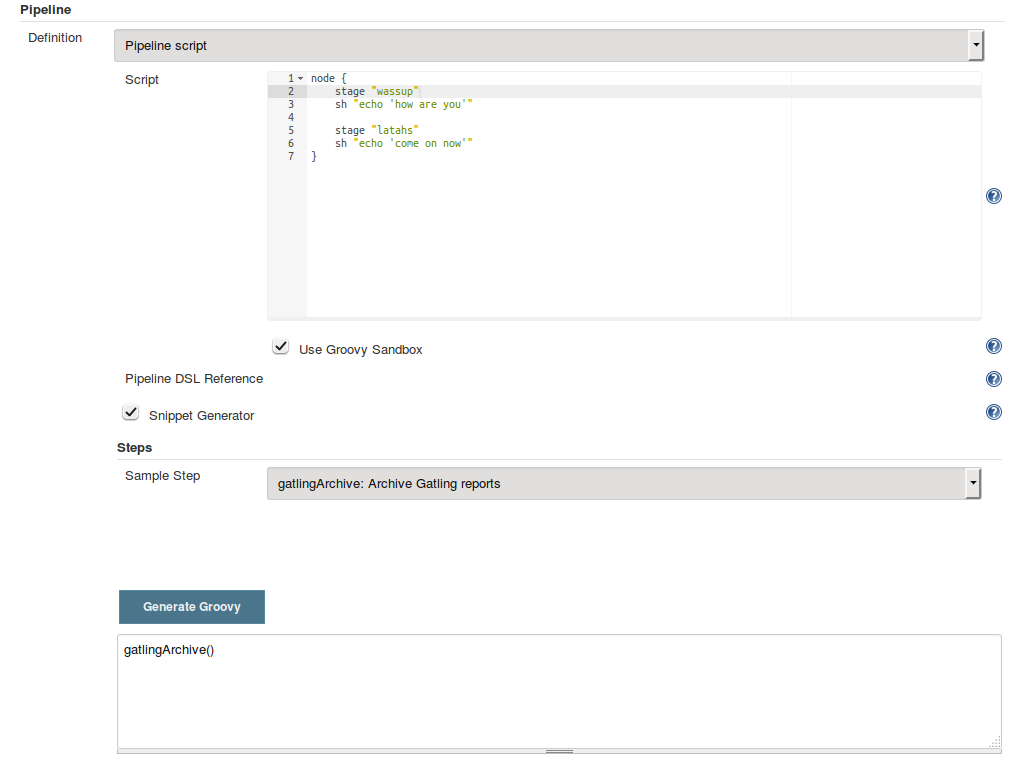 The main task that the Gatling plugin performs is to archive Gatling reports after a run. I figured that the end game for this exercise was that I was going to end up with a Pipeline "step" that I could include in my Pipeline scripts, to trigger the archiving of the reports. So my first thought was to look for an existing plugin / Pipeline "step" that was doing something roughly similar, so that I could use it as a model. The Pipeline "Snippet Generator" feature (create a pipeline job, scroll down to the "Definition" section of its configuration, and check the "Snippet Generator" checkbox) is really helpful for figuring out stuff like this; it is automatically populated with all of the steps that are valid on your server (based on which plugins you have installed), so you can use it to verify whether or not your custom "step" is recognized, and also to look at examples of existing steps.
