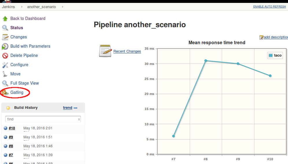 At this point our modified Gatling plugin should work the same way as it always did in a Freestyle build, but in a Pipeline build, it only partially works. Specifically, the Gatling plugin implements two different "Actions" to surface things in the Jenkins GUI: a "Build" action, which adds the Gatling icon to the left sidebar in the GUI when you’re viewing an individual build in the build history of a job, and a "Project" action, which adds that same icon to the left sidebar of the GUI of the main page for a job. The "Project" action also adds a "floating panel" on the main job page, which shows a graph of the historical data for the Gatling runs.