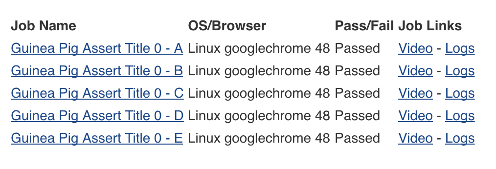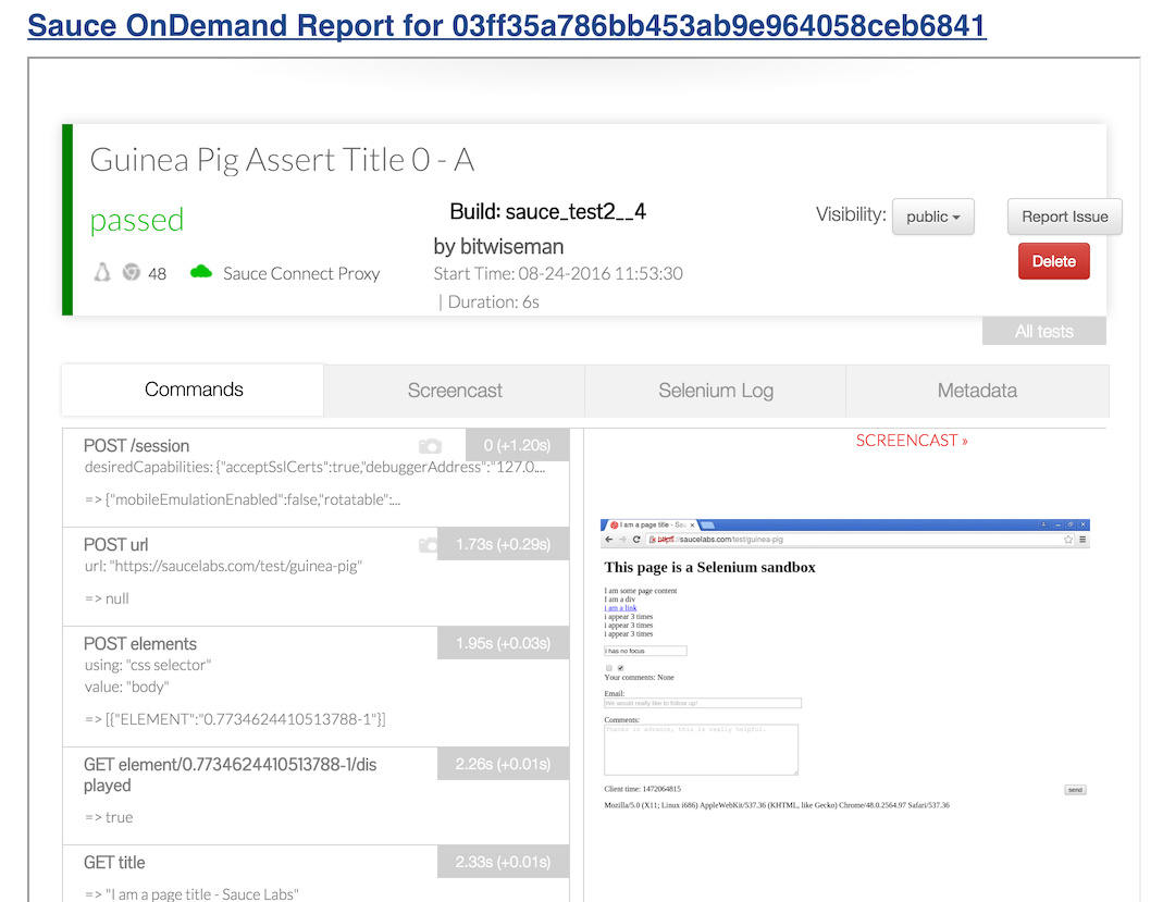 This sample app generates the SauceOnDemandSessionID for each test, enabling the Jenkins Sauce OnDemand Plugin’s result publisher to link results to details Sauce Labs captured during the run.