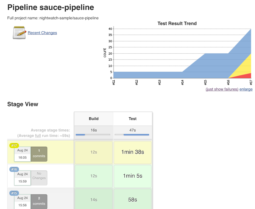 Not only is the pipeline as code more compact, it also allows for comments to further clarify what is being done. And as I noted earlier, changes to this pipeline code are committed the same as changes to the rest of the project, keeping everything synchronized, reviewable, and testable at any commit. In fact, you can view the full set of commits for this blog post in the blog/sauce-pipeline branch of the bitwiseman/JS-Nightwatch.js repository.