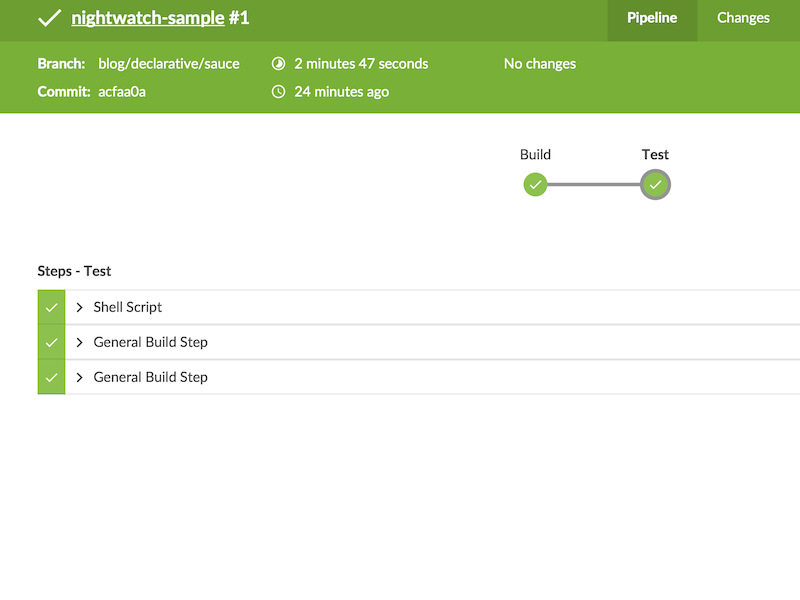 Each time we’ve moved a project from Scripted Pipeline to Declarative, we’ve found the cleaner format of Declarative Pipeline highlights the less clear parts of the existing Pipeline. In this case, the first thing that jumps out at me is that the parameters of the Saucelabs and Nightwatch execution are hardcoded and buried down in the middle of our Pipeline. This is a relatively short Pipeline, so it isn’t terribly hard to find them, but as this pipeline grows and changes it would be better if those values were kept separate. In Scripted, we’d have defined some variables, but Declarative doesn’t allow us to define variables in the usual Groovy sense.