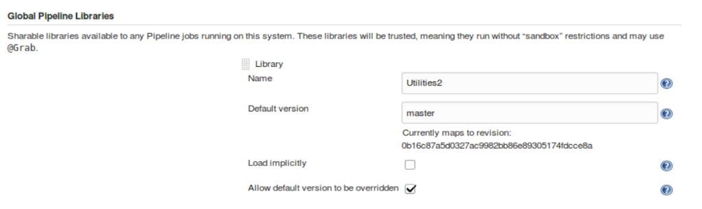To keep it simple, we’ll just define ours to be globally available to all pipelines. Doing this is a two-step process. We first tell Jenkins what we want to call the library and define some default behavior for Jenkins related to the library, such as whether we wanted it loaded implicitly for all pipelines. This is done in the Global Pipeline Libraries section of the Configure System page.