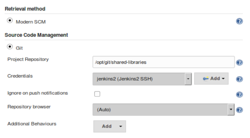 For the second part, we need to tell Jenkins where the actual source repository for the shared library is located. SCM plugins that have been modified to understand how to work with shared libraries are called "Modern SCM". The git plugin in one of these updated plugin, so we just supply the information in the same Configure System page.