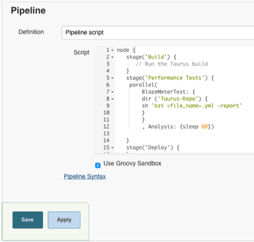 node { stage('Build') { // Run the Taurus build } stage('Performance Tests') { parallel( BlazeMeterTest: { dir ('Taurus-Repo') { sh 'bzt <file_name>.yml -report' } }, Analysis: { sleep 60 }) } stage(‘Deploy’) { } }