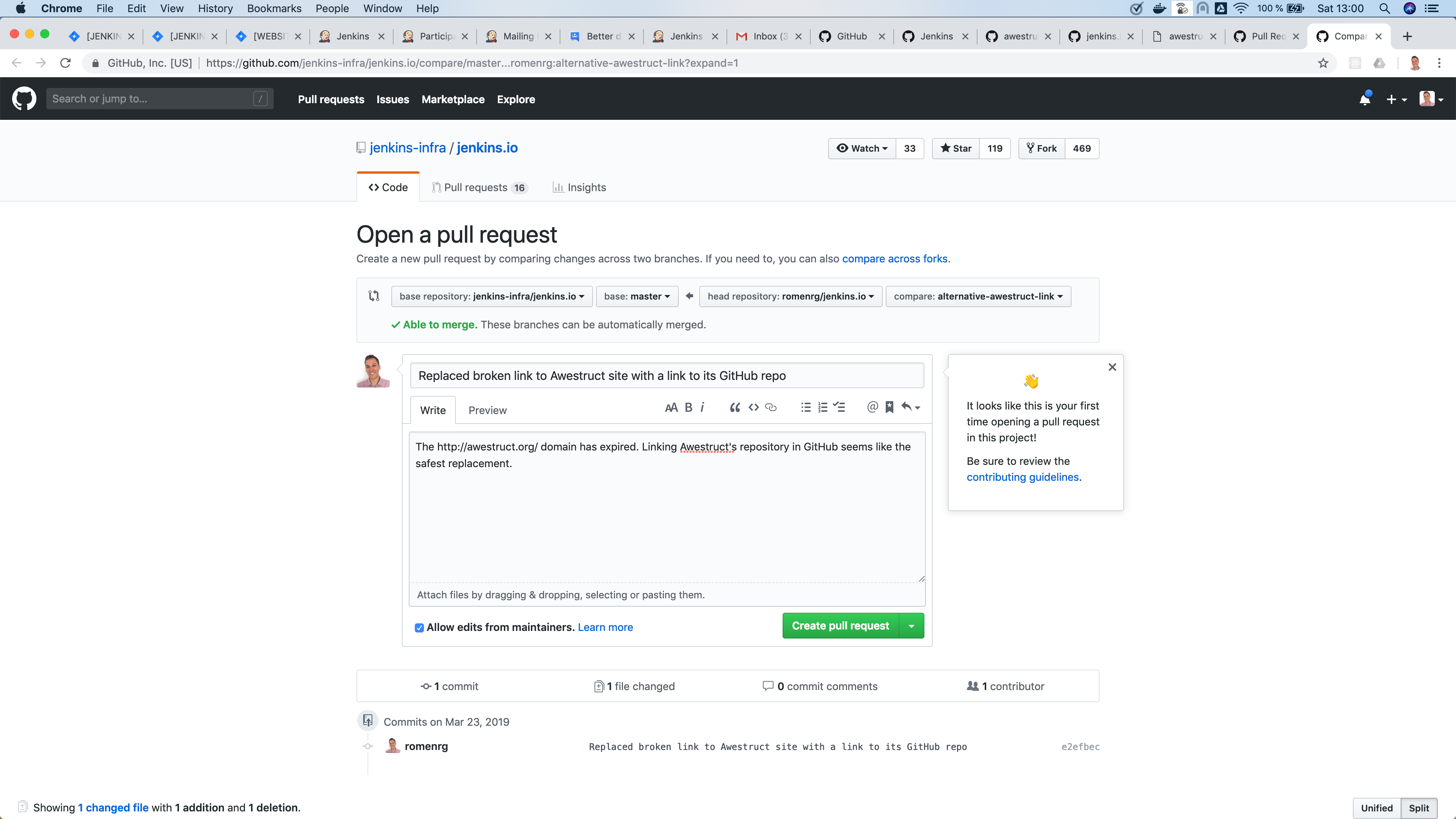 The next step would be to apply the change to the corresponding file. To do so, I created a new branch “alternative-awestruct-link” and applied the change there: