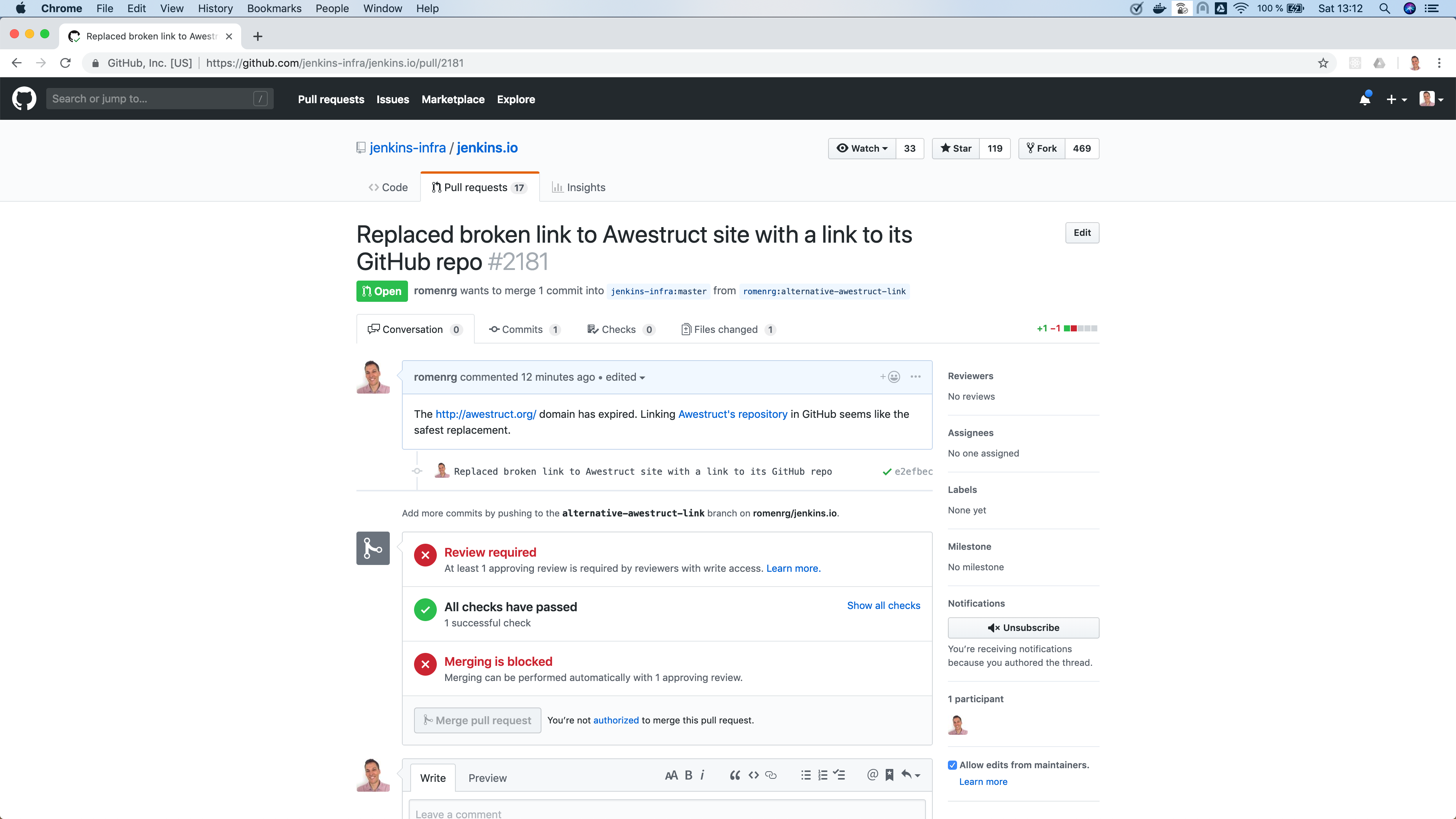 Once my change had been committed and pushed to my repository, I just had to create the PR. We have an easy way to do so by just clicking the link that we get in our git logs once the push is completed, although we can create the PR directly through the GitHub UI, if we prefer so; or even use “hub”, the GitHub CLI, to do it.