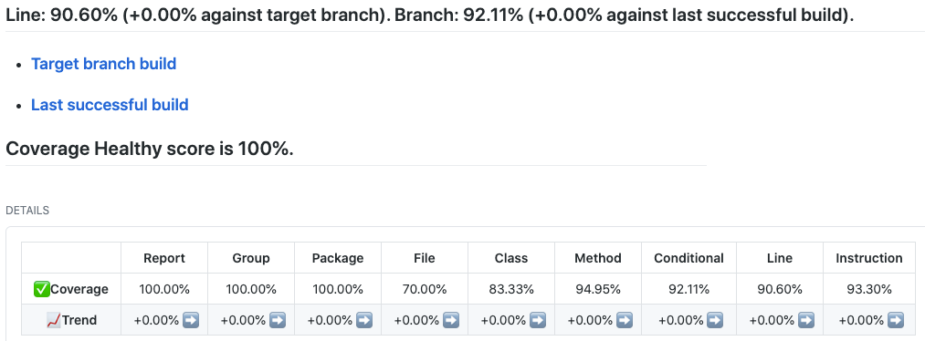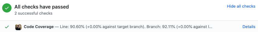 The coverage checks are achieved by consuming the API in Code Coverage API plugin. First, in the conversation tab of a PR, users will be able to see the summary about the coverage difference compared to previous builds.