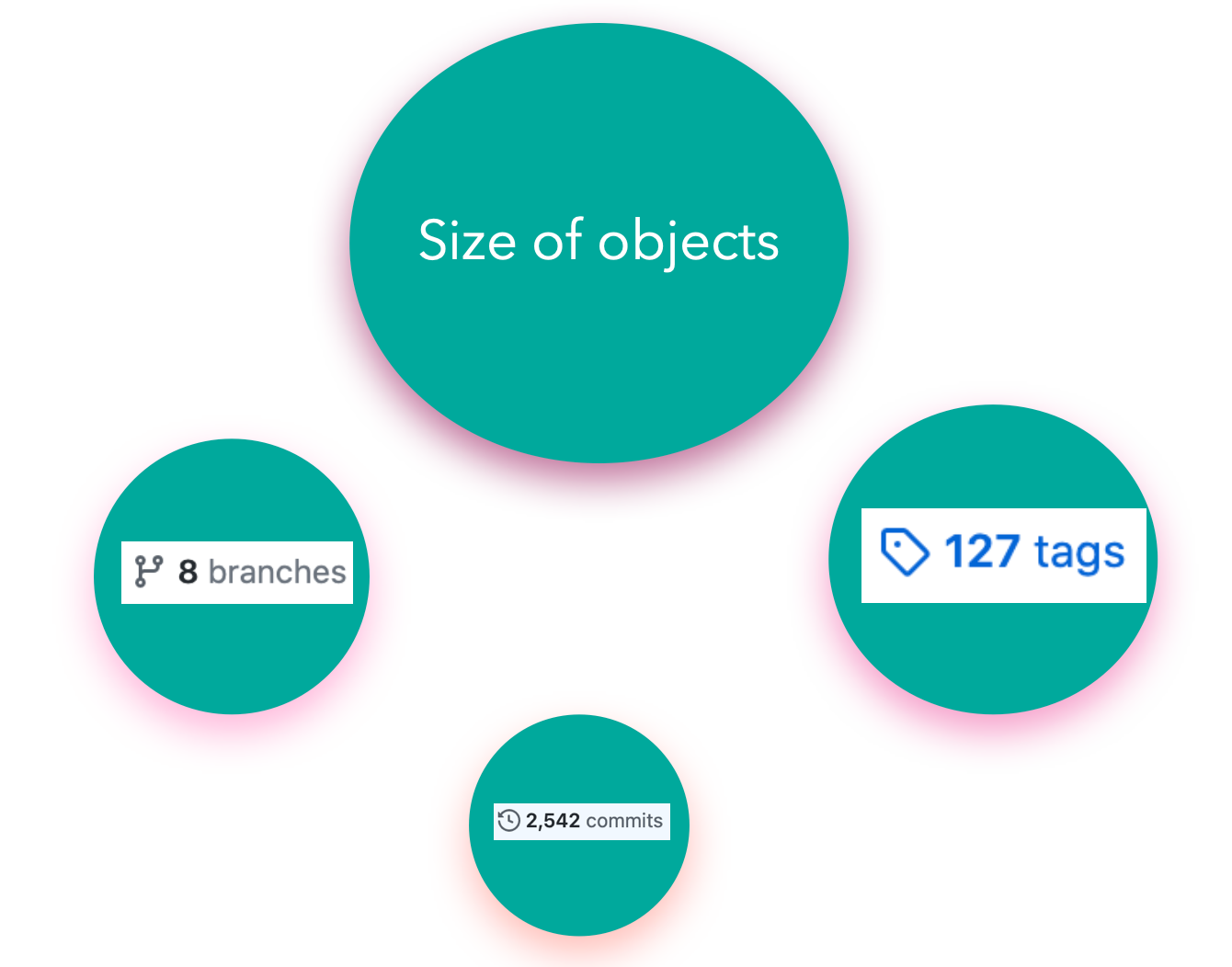 The area of the circle enclosing each parameter signifies the strength of the positive correlation between the performance of a git fetch operation and that parameter. From the diagram: