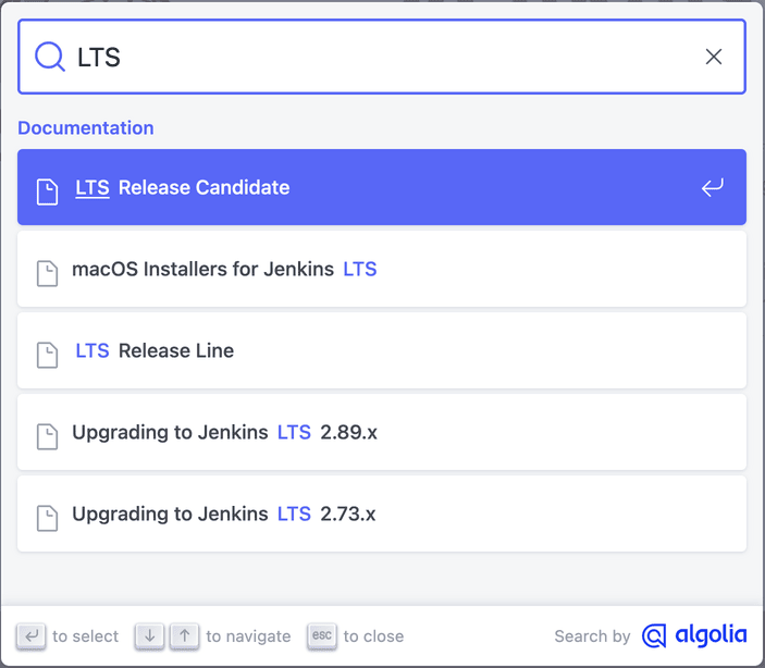 The Jenkins documentation site search has been updated to use the latest version of Algolia. We recognize and thank Gavin Mogan for his work on site search and on the plugins site. We thank Algolia for donating the search functionality. The site search now provides more relevant results and suggestions for users. A visual update was included as part of the upgrade, resulting in the new look and feel.