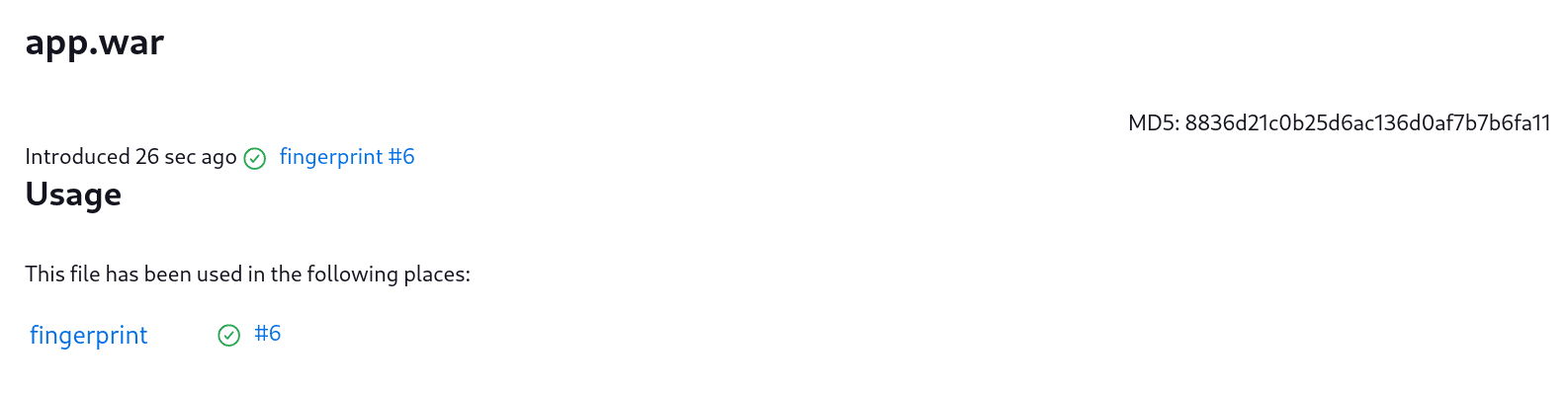 will archive any WAR artifacts created in the Pipeline and fingerprint them for traceability. This trace log of this artifact and a list of all fingerprinted artifacts in a build will then be available in the left-hand menu of Jenkins: