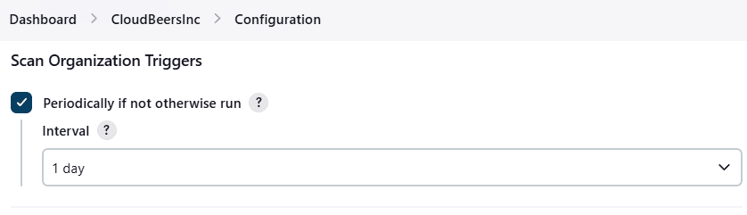 Folder scans can be automatically triggered through webhook callbacks whenever branches or repositories are created or removed. Scans can also be configured to run periodically via the Build Triggers settings, which default to a re-scan after one day of inactivity.