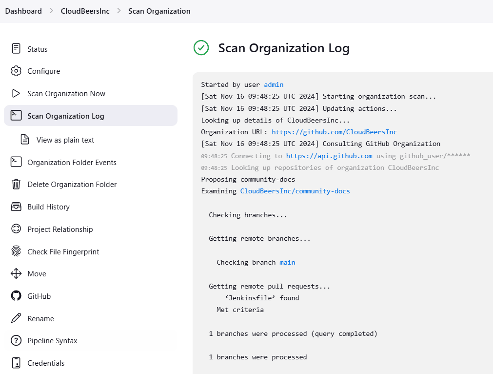 The log from the last attempt to scan the organization is available in the Scan Organization Log. If the scan doesn’t produce the expected set of repositories, the log may contain useful information to help diagnose the issue.