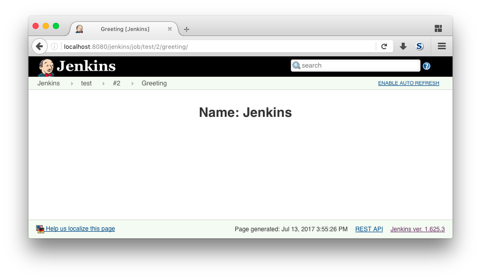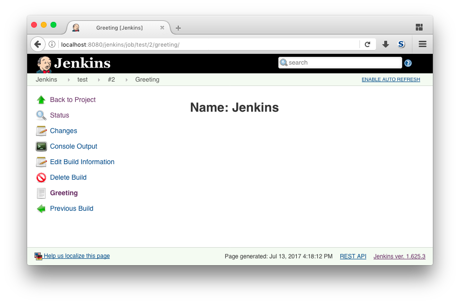 With these changes, the action will show in the build’s side panel, and link to the URL \http://JENKINS/job/JOBNAME/BUILDNUMBER/greeting/.