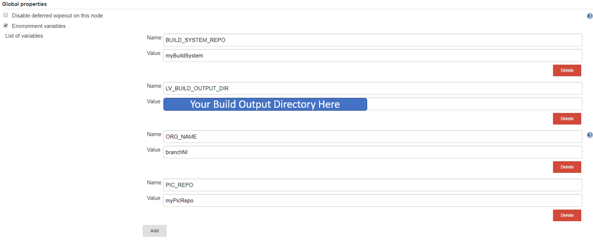 Click Add another time and add the LV_BUILD_OUTPUT_DIR environment variable. This should be an empty local directory anywhere on your computer, that LabVIEW will build and output files to. For instance, you may use something like C:\Windows\Temp\jenkins.