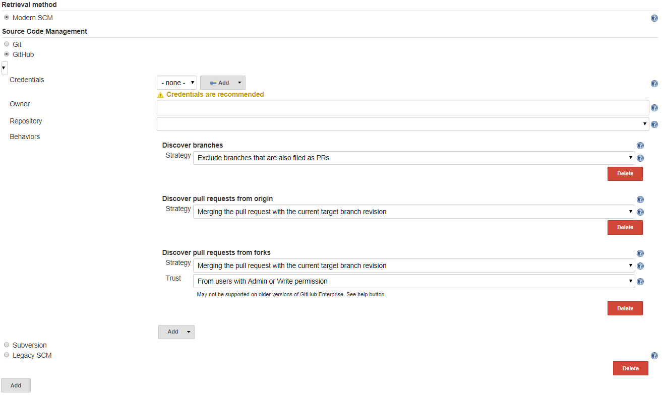 Now, we’ll want to select the Retrieval method. For this example, we’ll use Modern SCM. Select the Modern SCM radio button, followed by the GitHub radio button under Source Code Management:
