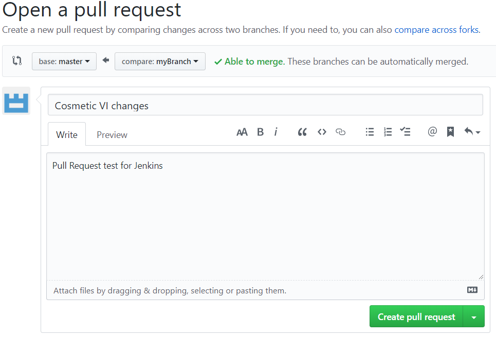 If you’re satisfied with the results, you can scroll to the bottom of the Pull Request and click Merge pull request to merge the changes with the master branch.