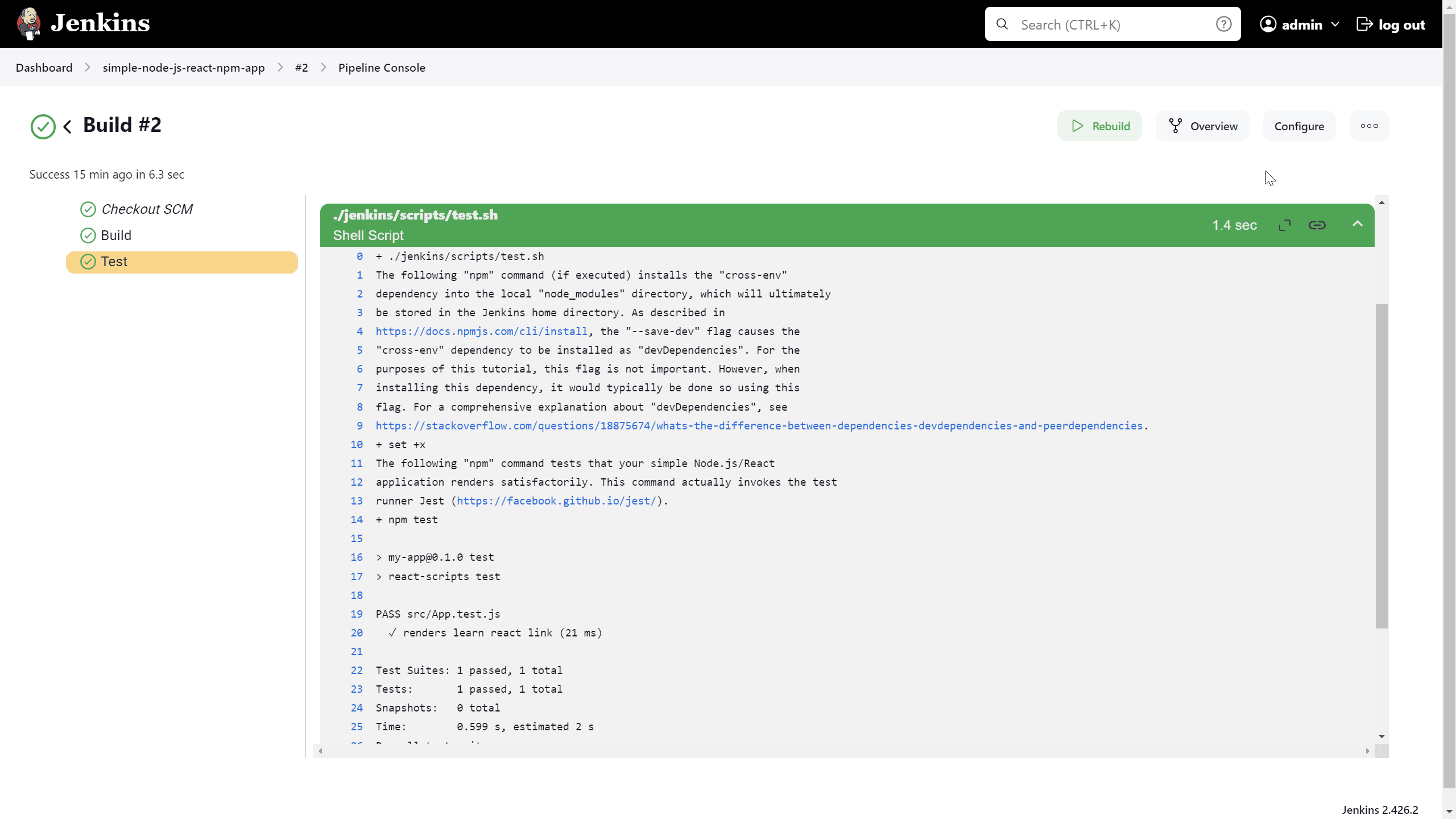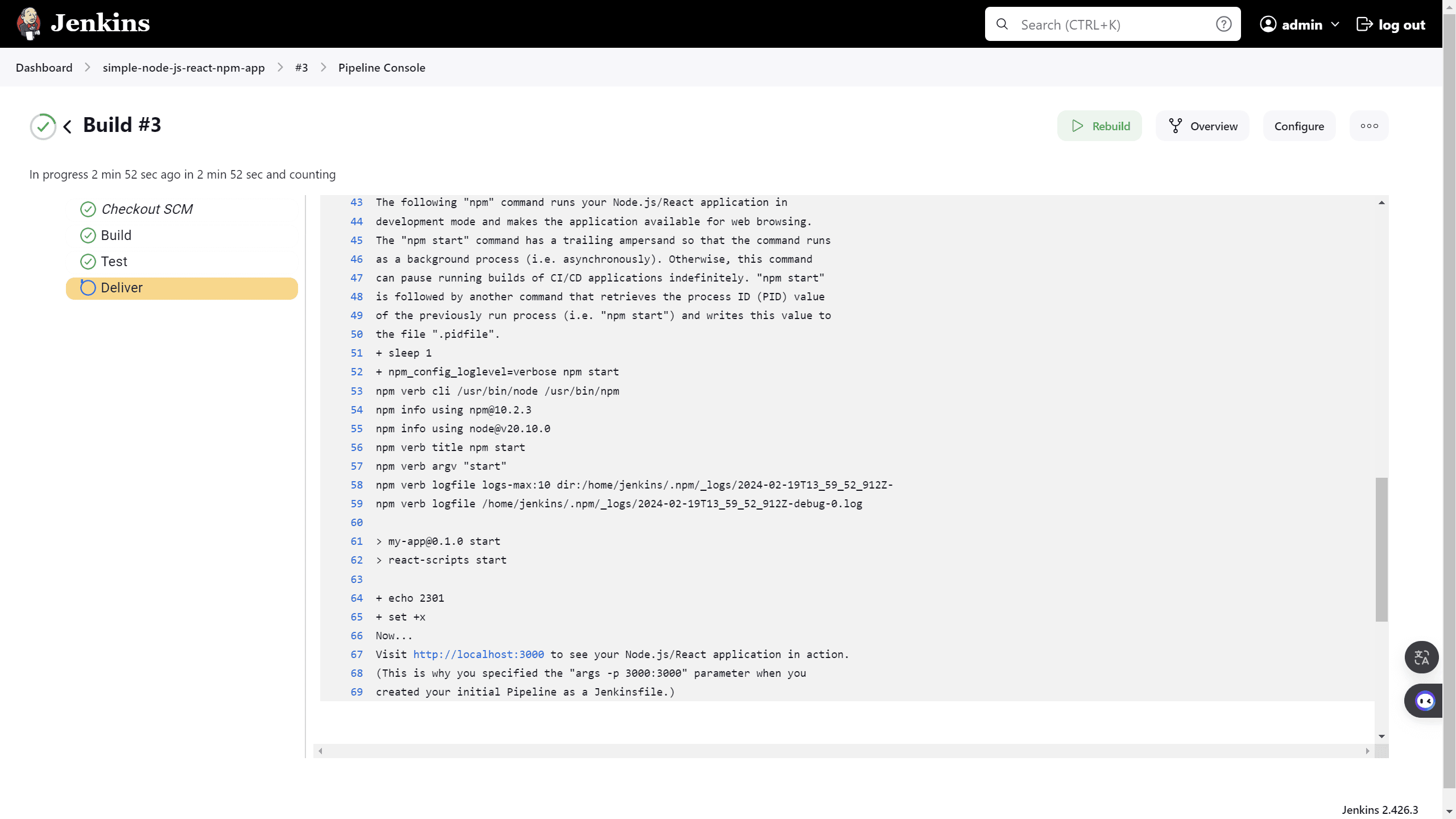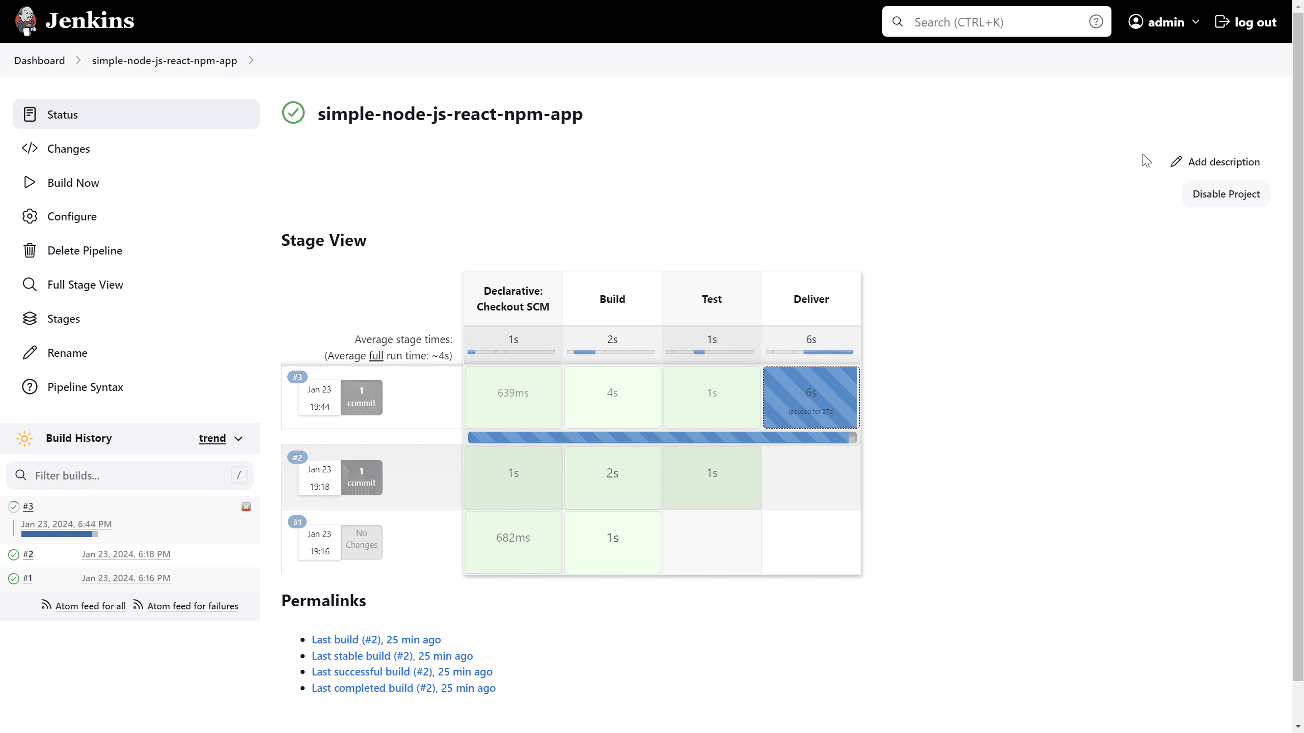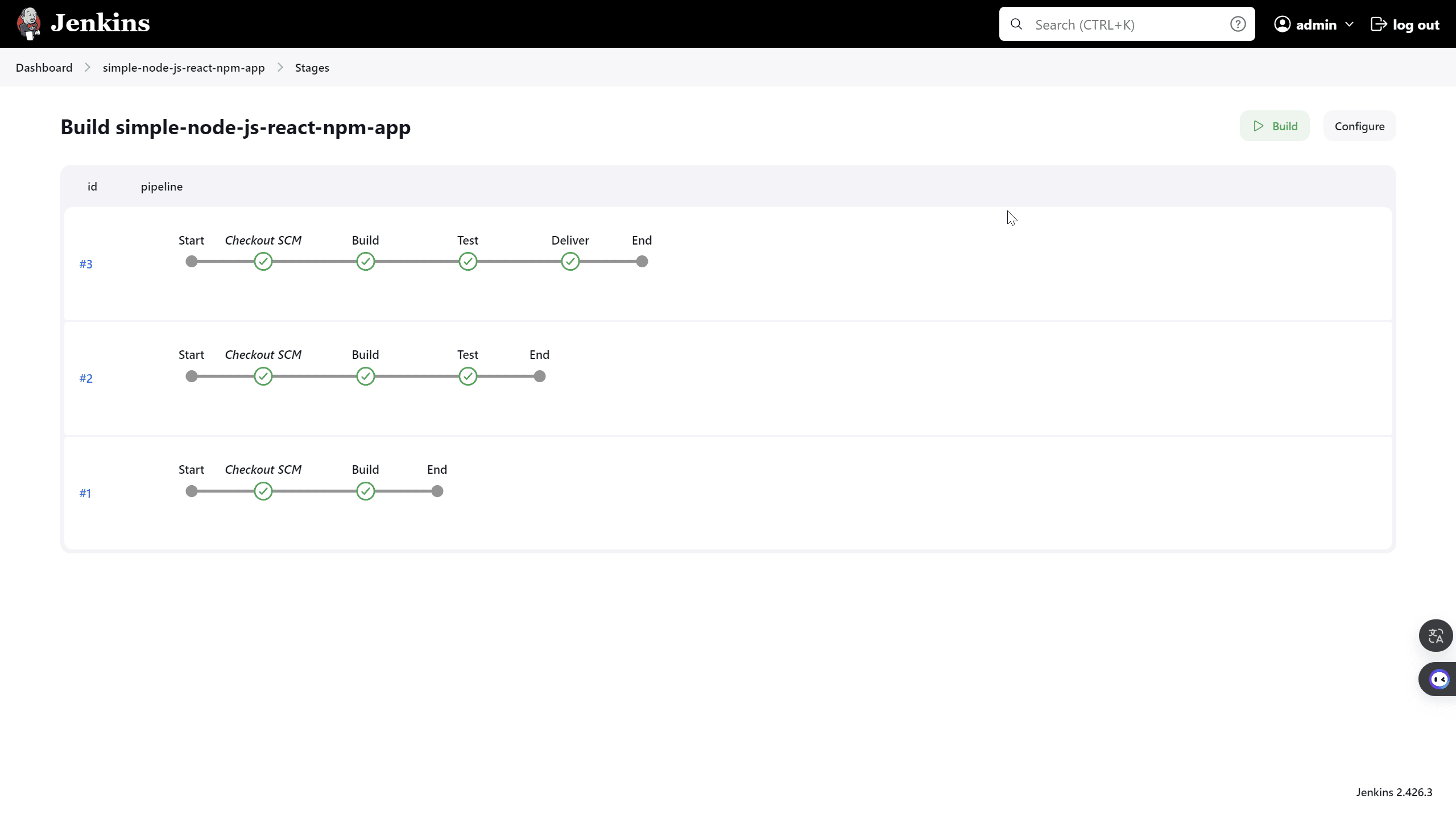 The "Build", "Test" and "Deliver" stages you created above are the basis for building more complex Node.js and React applications in Jenkins, as well as Node.js and React applications that integrate with other technology stacks.