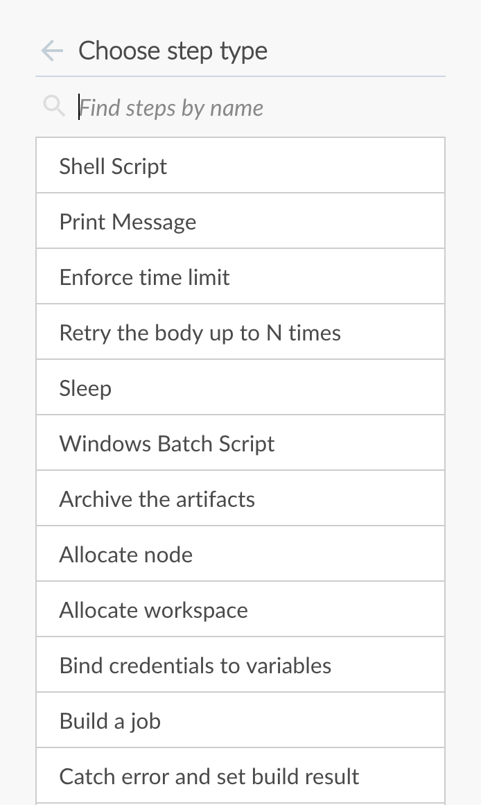 | The most commonly used step types appear closest to the top of this list. To find other steps further down this list, you can filter this list using the Find steps by name option. |