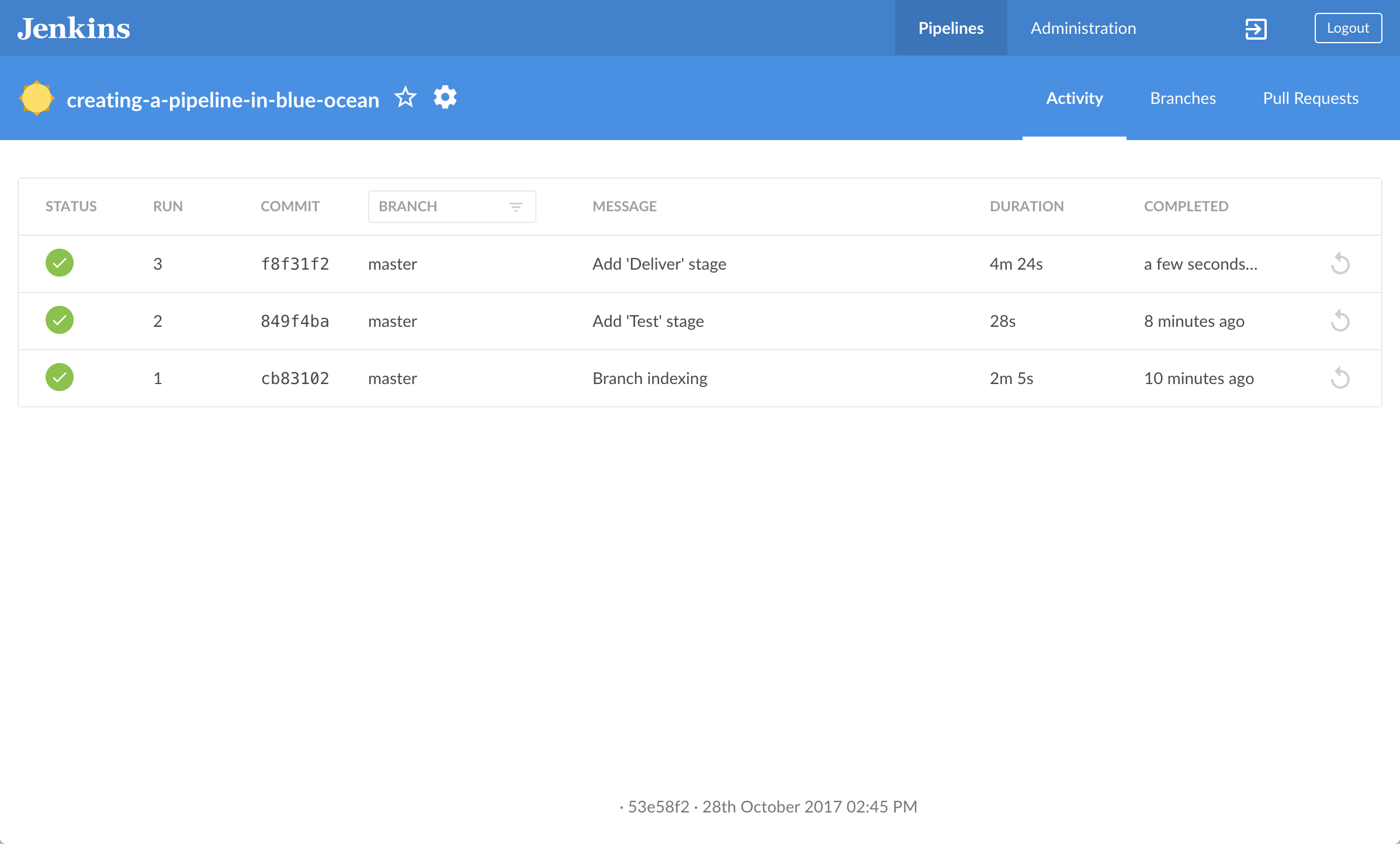 If your amended Pipeline ran successfully, here’s what the Blue Ocean interface should look like. Notice the additional "Deliver" stage. Selecting the previous "Test" and "Build" stage circles provides access to the outputs from those stages.
