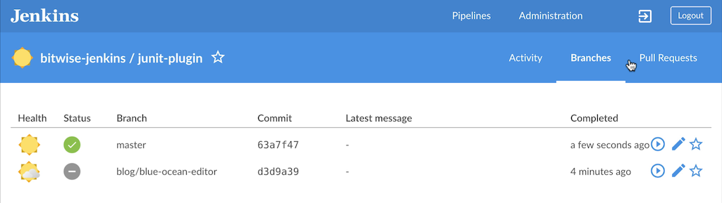 点击该列表的一个分支, 为最近完成或在进行中的该分支中的运行提供 流水线运行细节。 "In Progress" runs 可以通过点击 "Stop" 符号 (在一个圆中的 "◼" )从列表中中止。 Pull 请求的最近一次的完成可以通过点击"Play" 符号(一个圆中的 "▶" ) 进行再次运行。 单击"Edit" 符号 (类似于铅笔 "✎")为该分支上的流水线打开 流水线编辑器。 点击 "Favorite" 符号 (一个星的轮廓 "☆")添加分支到收藏列表,为该用户显示在 仪表盘的 "Favorites" 列表z中 。 一个已被收藏的分支会显示一个实心的 "★" 点击它就可以从收藏中移除该分支。