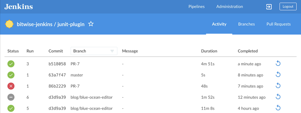 Blue Ocean 额的活动视图显示了与流水线相关的所有活动。
