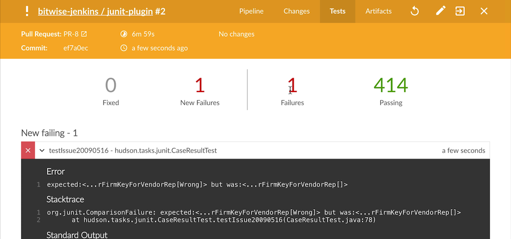 这是默认选项卡并给出了该流水线运行的留的总体视图 他显示每个阶段河道并行分支, 这些阶段中的步骤, 以及这些步骤的控制台输出。上面的概述图像显示了一个成功的流水线运行。 如果运行中的某个步骤失败, 该选项将自动默认显示来自失败步骤的控制台日志。 下图显示了一个失败的运行。